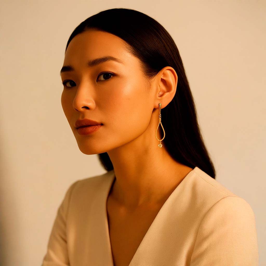 Uma pequena pedra natural lapidada em formato de gota repousa sobre base folheada a ouro. Ideal para quem busca um toque de cor com elegância discreta.