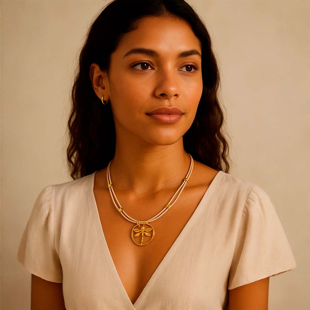 Inspirado na força serena da natureza, o Colar Esplendor de Gaia envolve o colo como uma prece silenciosa — revelando a beleza de quem floresce por dentro.